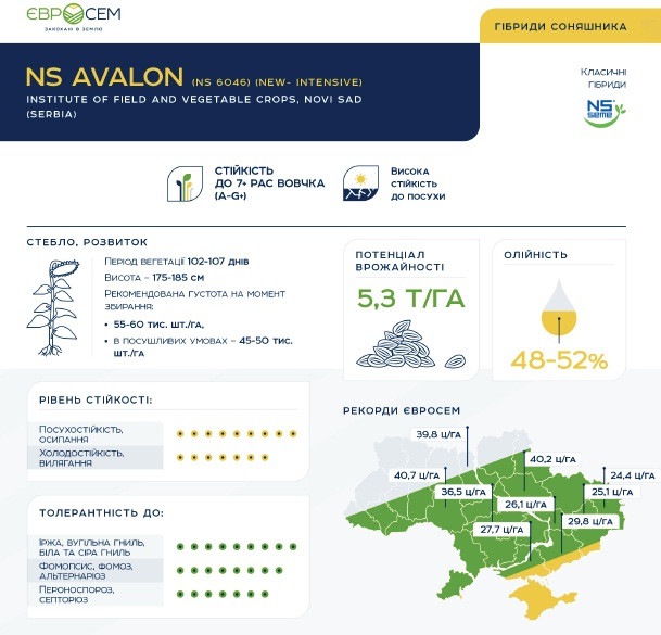 Насіння соняшника Авалон (Avalon, NS 6046) – гібрид для вирощування за традиційною технологією. Має стійкість до 7+ рас вовчка. Оригінатор – Інститут рільництва і овочівництва НС Семе (Сербія).